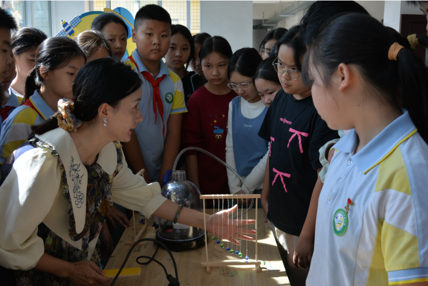 活动现场设 “创意发明区”“科学实验区”。相关老师、学生结合解说词与演示视频,讲解垃圾分类小装置、节水提醒装置等数十件作品,现场进行多个科学实验;同学们纷纷驻足聆听讲解,观看演示,并与负责讲解的老师同学积极互动,共同探索科学奥秘。