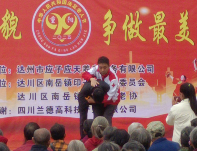 印子村党总支书记唐毅详细介绍村“两委”为老年人服务的举措,并呼吁社会各界持续关注老年人福祉,并宣布文艺表演正式开始。其间,还为全村20余名最美老人发放暖心纪念品,表达对长辈的敬意。达州市红十字会工作人员讲解和展演自救的方式方法等知识。
