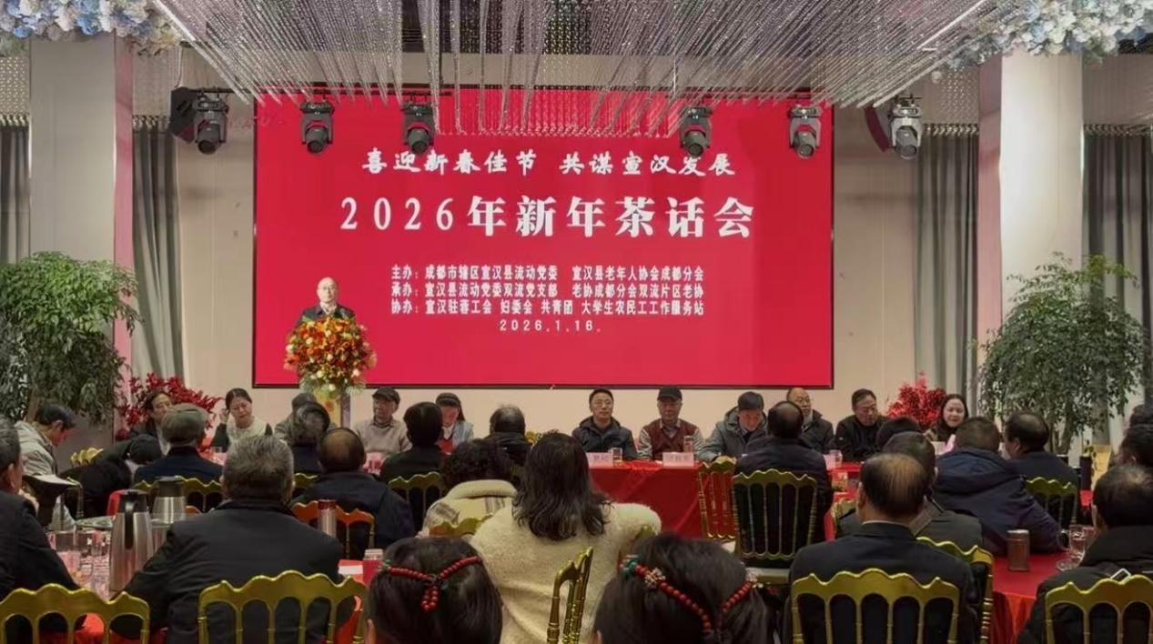 近日,成都辖区宣汉流动党委、宣汉老协成都分会联合主办的“喜迎新春佳节·共谋宣汉发展”2026年新年茶话会圆满举行。