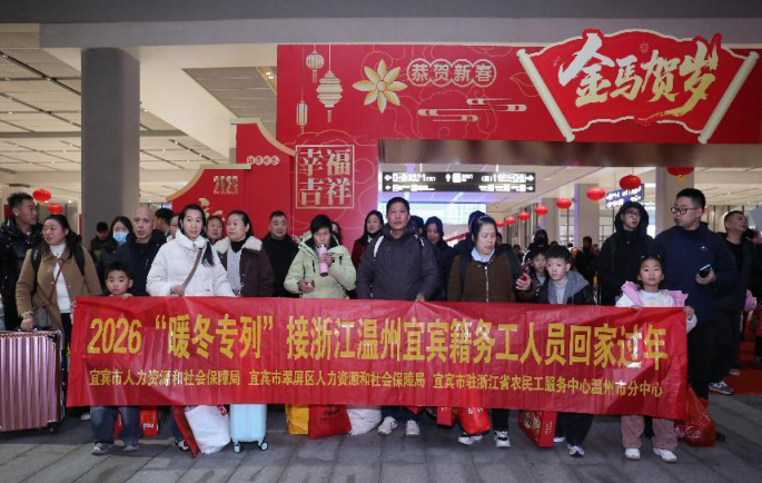 为切实解决在温宜宾籍务工人员春运“一票难求”的问题,平衡务工人员返乡与企业年底用工需求,传递温州、宜宾两地政府对务工群体的关怀,2月9日,宜宾市、翠屏区人社局联合宜宾市驻浙江省农民工服务中心温州分中心、翠屏区驻温州流动党员党支部(农民工服务站)等单位,开展2026“暖冬专列”返乡包列、接驳专项活动,组织180名在温宜宾籍务工人员搭乘专属包列平安返乡。