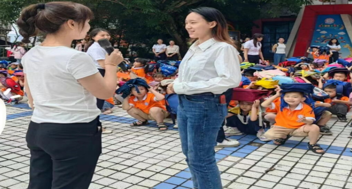 室外疏散撤离。一分钟后,随着第二次警报声响起,孩子们在教师的组织下,弯腰低身,双手抱头或者用书包遮住头等方法护住头部,沿着逃生路线快速、有序地撤离到园门口的空旷处,用时2分48秒。