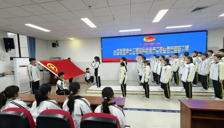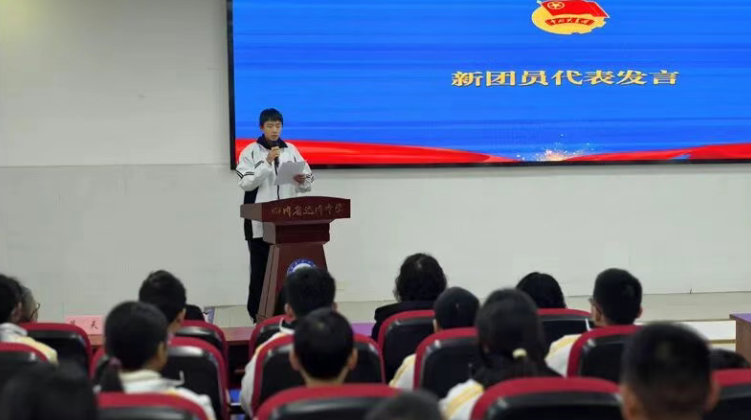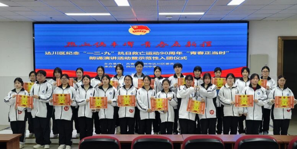 为弘扬爱国主义精神,激励广大青少年铭记历史、砥砺前行,12月9日,由共青团达川区委主办,四川省达川中学承办,纪念“一二·九”抗日救亡运动90周年“青春正当时”朗诵演讲活动暨示范性入团仪式在达川中学三里校区学术报告厅举行。学校校级领导、达川中学三里校区团员青年代表、新发展团员及部分师生代表齐聚一堂,共同参与了这场富有教育意义和青春气息的主题活动。 铭记历史 面向未来 活动在播放“一二·九”抗日救亡运动微视频中拉开序幕,在庄严的国歌声中,全体师生肃立致敬,歌声激荡。 学校党委委员、副校长王莉宣布了94名新团员名单,铿锵有力的声音,一个个名字背后,是川中学子对先进组织的向往与追求。 随后,学校校级领导为新团员佩戴团徽并颁发团员证,一枚小小的徽章,一本崭新的团员证,承载着荣光,更镌刻着责任。 新团员代表严梓俊的发言道出了大家共同的心声:“从今天起,我们不仅是个人的进步者,更是光荣使命的坚定信仰者、积极传播者、模范践行者。” 在示范性入团仪式环节,面对鲜艳的团旗,一批经过严格培养和考核的先进青年学生,庄严宣誓,怀着激动的心情加入了中国共产主义青年团。仪式庄重而热烈,充分展现了共青团组织的先进性和凝聚力,为全区各中学规范开展入团仪式提供了示范。 接着,达川中学党委书记代光兵向本次活动发表致辞,他寄语新团员:“以‘一二·九’运动的先驱为榜样,不负时代,不负韶华,努力成长为社会主义建设者和接班人,让青春在不懈奋斗中绽放绚丽之花!” 仪式尾声,全场齐声高唱《光荣啊,中国共青团》,歌声响彻会场。师生们神情庄重而坚定,仿佛在诉说:九十年前的热血从未冷却,新时代的青春之歌却愈发嘹亮。 随后进行的“青春正当时”朗诵演讲活动将现场气氛推向高潮。15组优秀学生代表围绕“一二·九”运动的历史意义、爱国主义精神的时代传承、青年一代的使命担当等主题,或慷慨激昂,或深情诉说,用真挚的情感和铿锵的语言,回望九十年前北平学子救亡图存的壮举,抒发新时代青少年热爱祖国、立志成才、奋进新征程的豪情壮志。他们的精彩表现,深深地感染了在场的每一位听众,赢得了阵阵掌声。 本次活动不仅是一次深刻的历史教育、爱国主义教育,也是一次生动的团课教育和青春励志教育。它成功地将历史记忆与时代召唤相结合,有效引导青少年厚植家国情怀,增强历史使命感与社会责任感,进一步凝聚起“请党放心,强国有我”的青春共识,激励广大团员青年以更加昂扬的姿态,在新时代的征程上书写无愧于时代的青春华章。