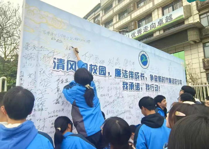 为深入推进校园廉洁文化建设,引导学生树立正确的价值观和道德观,四川省达州中学以俊采节为契机,精心策划并开展了“清风润校园,廉洁伴成长,争做新时代廉洁好少年”主题活动。活动历时数日,通过丰富多样的形式、寓教于乐的内容,让廉洁精神深入人心,取得了圆满成功,赢得了全校师生的广泛赞誉。 活动现场,达州中学党委委员、纪委书记杨霜号召全体学生积极参与廉洁主题活动,将廉洁精神融入日常学习生活,争做新时代廉洁好少年。随后,精心布置的“廉洁走廊”正式开放,《“抄”人的烦恼》《“独臂侠”的抗议》等四个主题展板,以漫画、连环画等生动形式,将“诚信学习”“珍惜粮食”等廉洁内涵具象化。同学们以班级为单位或自由前往,在志愿者的细致讲解下,认真聆听廉洁故事、观看生动画面,深刻领悟到廉洁并非抽象概念,而是体现在诚信作业、节约粮食、爱护公物等点滴行为中。 参观结束后,同学们纷纷来到“廉洁签名墙”前郑重签名,许下“坚守廉洁初心,践行文明行为”的承诺。杨霜书记亲临现场,为同学们颁发廉洁读本,鼓励大家将廉洁理念内化于心、外化于行。佩戴“廉洁监督岗”袖章的志愿者们,不仅有序发放“廉洁小卫士”勋章、维持活动秩序,还在校园内巡查,对乱扔垃圾、损坏公物等不文明行为进行友好提醒,用实际行动践行廉洁精神。 此次活动得到了同学们的热烈响应和高度认可。大家纷纷表示,活动形式新颖、贴近生活,让自己对廉洁有了更深刻的理解。不少同学分享道,今后会自觉做到诚信学习、拒绝抄袭,珍惜粮食、杜绝浪费,同时主动监督身边的不文明行为,争做合格的“廉洁小卫士”。 作为达州中学推进廉洁文化进校园的重要举措,此次活动通过沉浸式体验、互动式参与,让廉洁种子在学生心中生根发芽,有效引导学生坚守廉洁底线、涵养高尚品格。未来,学校将持续深耕校园廉洁文化建设,让清风正气陪伴每一位学子健康成长。