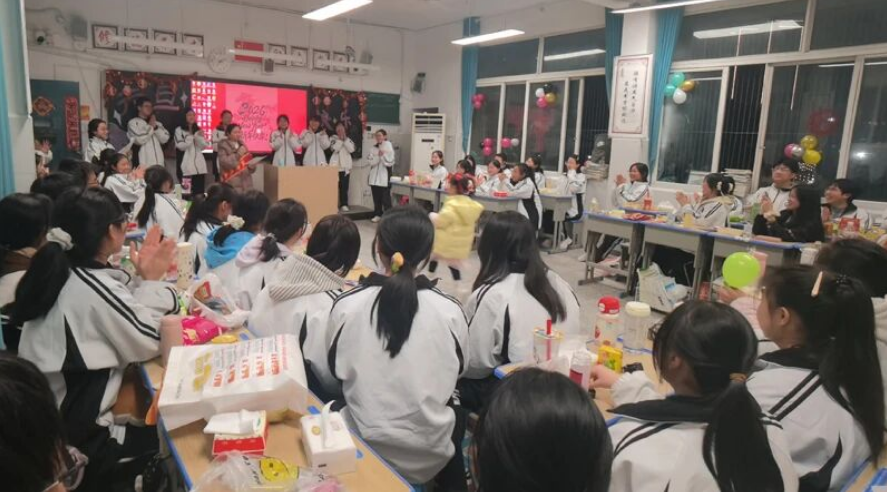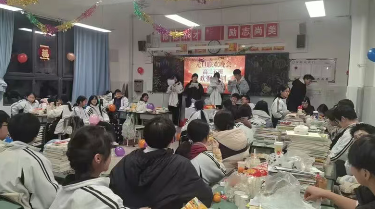 12月30日晚,四川省达川中学校园内彩灯闪烁,欢声笑语不绝于耳,全校各班同步开展了以“辞旧迎新,飞扬青春”为主题的元旦晚会,学生自主策划、全员参与,共同营造了一个充满喜庆与温暖的迎新之夜。 喜气洋洋迎新年 当晚,各班似乎都变成了小小的“创意坊”。学生们亲手装点教室,门窗上贴满了寓意吉祥的剪纸和新年寄语,黑板上绘有五彩斑斓的元旦主题板报。气球、彩带、串灯和闪烁的荧光棒交相辉映,平日里严肃的学习空间变成了温馨而欢快的喜庆现场。 不仅仅是场景的布置装扮,各班在美食准备上也下足了功夫。课桌上摆满了糖果、糕点、瓜子和花生等零食,饮料琳琅满目。更有班级别出心裁,准备了烧烤、干锅等特色美食,香气四溢,增添了浓厚的节日气氛与生活气息。 晚会节目更是丰富多彩,各班活动设计各具特色,既有深情动人的歌曲演唱、活力四射的现代舞蹈,还有趣味表演、乐器演奏等。初三.16班制作的创意蛋糕嵌上了全班学生的名字和祝福语;初三.17班用课桌拼成餐桌,让同学们在聚餐、交流中度过一个有意义的晚宴式晚会;初二.11的趣味模仿秀,孩子们像模像样的模仿逗得大家笑声不断……多姿多彩的活动促进了师生互动,拉近了彼此距离,轻松愉悦的笑声溢出教室,在走廊、校园回荡、交汇。 有的班级还设置了“感恩与展望”环节,同学们分享过去一年的成长感悟,并写下对新一年的美好愿望。老师们也融入其中,或献歌一曲,或参与游戏,与学生们共同庆祝,现场气氛融洽而热烈。 “这次晚会从策划、布置到表演,基本上都由学生自己完成,大家感觉特别有成就感。不仅玩得开心,班级也更团结了。”走进一个教室,高一.16班一位学生兴奋地说道。班主任覃老师也表示,“这是一堂生动的实践课,孩子们在筹备中锻炼了策划、组织、协调能力,在展示中增强了自信,在欢乐中释放了学业压力,以饱满的精神状态迎接新的一年。” 近年来,达川中学十分重视学生的全面发展,鼓励学生自主组织各类活动。此次全校元旦晚会,旨在营造积极向上的校园文化氛围,让学生在感受传统文化魅力的同时,提升综合素养,增强集体归属感。 新年的钟声即将敲响,达川中学的师生在这个自编自导自演、自娱自乐的温馨夜晚,以青春的热情与欢笑,告别充实的一年,共同迎接充满希望的2026年。