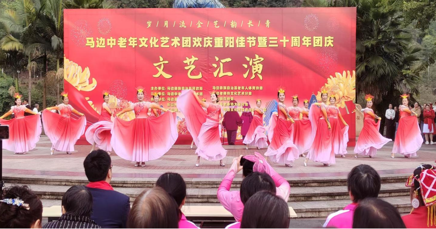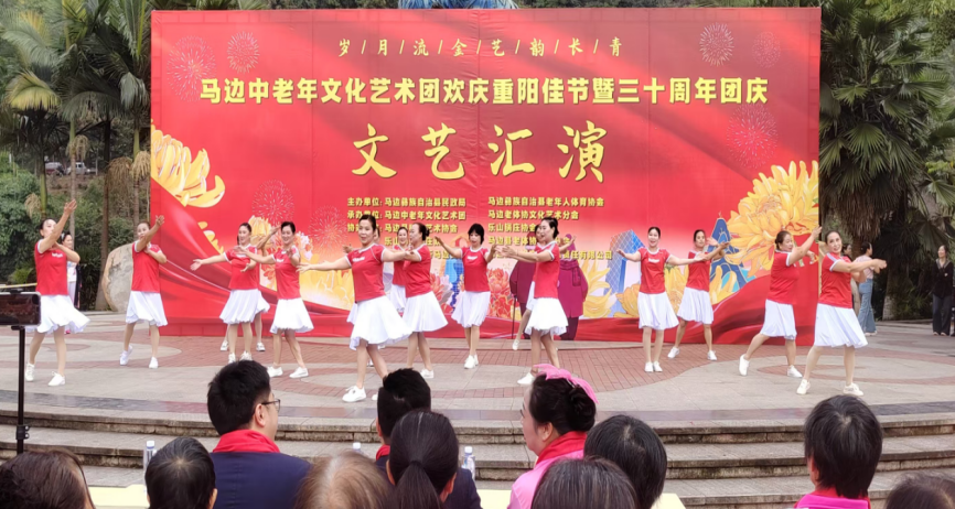 10月30日上午,马边彝族自治县张坝社区熊猫广场座无虚席,热闹非凡,现场洋溢着一片喜庆、欢乐、祥和的浓厚氛围。以“岁月流金·艺韵长青”为主题的马边中老年文化艺术团欢度重阳佳节暨成立30周年团庆文艺汇演活动在此隆重举行。
