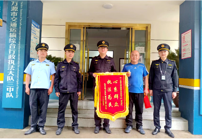 2022年5月25日上午,万源市交通运输综合行政执法大队第三中队驻地迎来一位特殊的客人,将一面绣着“心系群众、执法为民”的锦旗赠予第三中队。