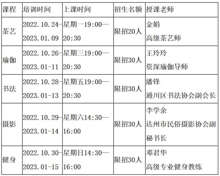 为更好地满足全区职工多样化需求,进一步丰富广大职工群众精神文化生活,响应“决战四季度、大干一百天”号召。根据四川省总工会办公室关于印发《关于进一步落实“拼经济、搞建设、促发展”十八条措施,加强工会经费管理使用的实施细则(暂行)》通知精神,通川区总工会精选优质课程在区职工活动中心举办职工兴趣培训班,面向全区机关事业单位、社区、企业在职职工招生,秋季免费培训班于2022年10月24日起正式开课。培训班共招5个不同类别班次,名额有限,报完即止。