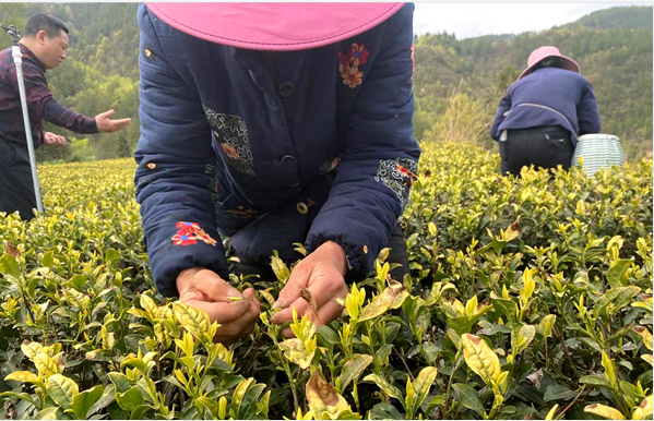 现正是采茶季,在这片金色大地上有着300余名茶农身挎采茶竹篓,穿梭在茶园之中,金黄的茶园中,一双双灵活的双手一捏、一提、一放,巧手左右轮换,上下翻飞,一片片金黄的茶叶在茶农手指上不停地飞舞,一捏一提一指间,竹篓里“茶精灵”越来越多。