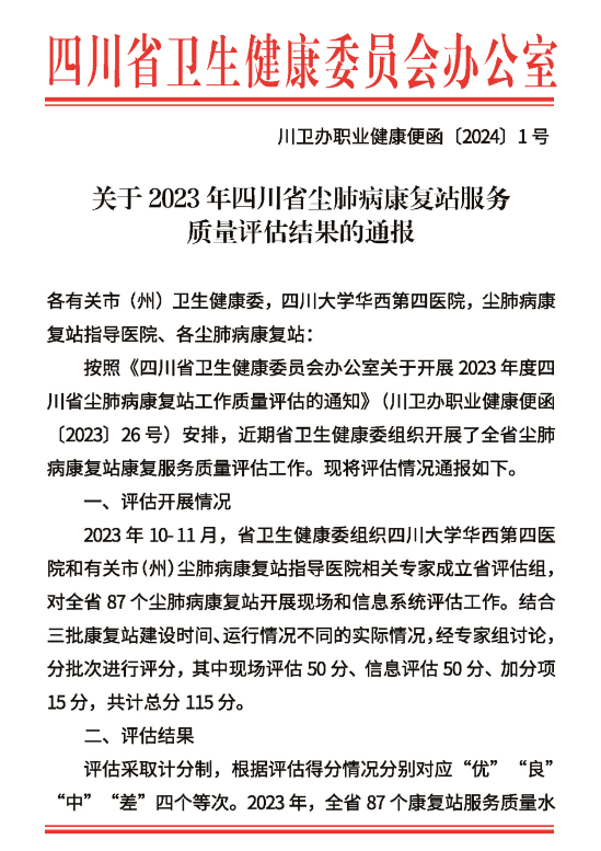 达川区渡市镇尘肺病康复站按照“七个一”(即一块尘肺病康复站标牌、一名经过康复治疗技术培训的医师、一名经过康复护理培训的护理人员、一处康复场所、一组适宜的康复器材、一套康复站职责制度、一套规范档案)的标准进行运行管理,逐步形成了“渡市镇康复站-达州市中心医院--四川大学华西第四医院省级中心”康复诊疗的运行维护新模式。2022年—2023年,在全省尘肺病康复站服务质量评估中,连续2年综合评估均荣获“优”的佳绩。 渡市镇尘肺病康复站将进一步完善尘肺病康复服务管理体系,不断提升管理水平和服务能力,确保尘肺病患者得到及时有效的康复治疗。(曹波)