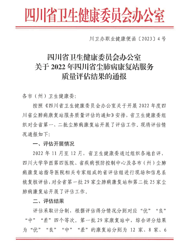 喜报!达川区渡市镇尘肺病康复站在全省尘肺病康复站服务质量评估中连续两年综合评估结果均获“优”的佳绩