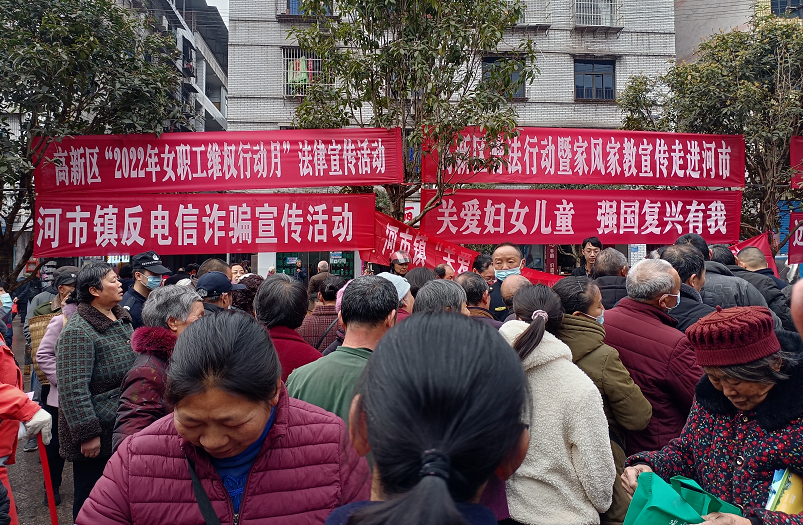 四川先锋网消息(吴波)2022年3月1日上午,在“三八”国际劳动妇女节即将到来之际,达州高新区总工会组织干部职工、律师顾问和志愿者队伍来到河市镇,开展以“中国梦·劳动美—喜迎二十大 建功新时代”暨纪念“三八”国际劳动节普法宣传活动。