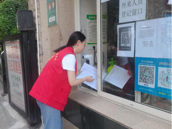 (图为:志愿者在南坝社区居民楼打扫楼院)