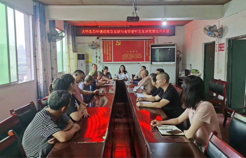 活动中,大竹生态环境局党总支部与老学堂村总支部开展了党建结对共建活动,大竹生态环境局机关委员会为老学堂村全体党员干部上了专题党课,就学习贯彻《中国共产党纪律处分条例》进行了全面分析解读,并与村干部进行集体座谈,听取驻村工作队工作情况汇报。