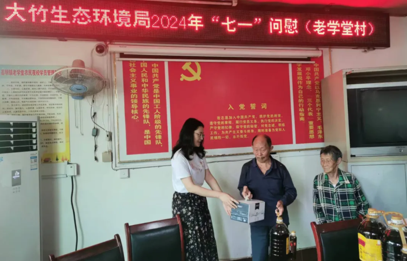 在“七一”建党节前夕,6月24日,达州市大竹生态环境局工作人员赴定点帮扶村高明镇老学堂村开展了庆祝中国共产党成立103周年系列活动,看望慰问驻村干部、生活困难党员和定点帮扶对象。