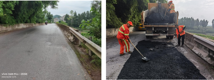 在6月份的一次巡查中,公路中心发现部分路段路面有不同程度的破损,影响车辆通行,存在有一定的安全隐患。中心迅速组织人员和设备进行修复,仅用两天时间就完成了修复工作,确保了道路畅通。