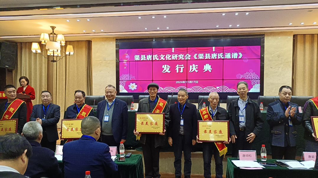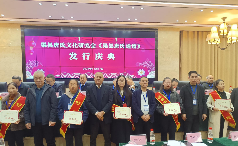 会上,渠县唐氏通谱编委会执行主编唐中华就《渠县唐氏通谱》编修过程、内容作讲解说明。接着举行《渠县唐氏通谱》颁发仪式。