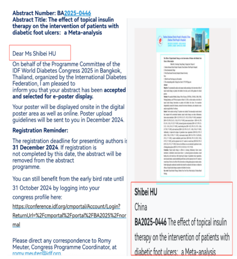 由达州市第三人民医院护理部胡诗贝领衔的Meta分析研究《The effect of topical insulin therapy on the intervention of patients with diabetic foot ulcers: a Meta-analysis》成功入选本次大会壁报展示环节。