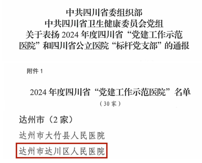 达州市达川区人民医院荣获“四川省公立医院党建工作示范医院”称号