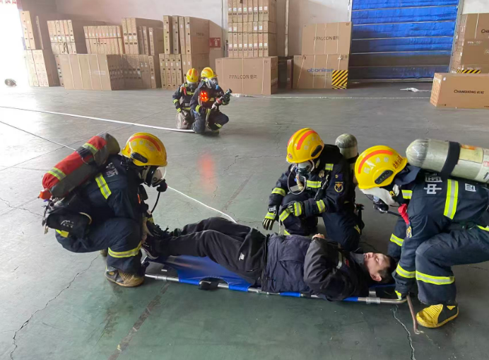 下午3点,按照演练方案,拉开了演练”的帷幕。达州公路物流港监控中心发现8号仓库有烟雾报警,马上联系执勤组赶赴现场查看,执勤组确认火情并立即反馈监控中心,监控员即刻拨打119、120请求支援,同时报告安全第一责任人,启动预案。现场执勤人员和保安紧急通知和指挥商家(业户)及员工沿着疏散应急指示从安全出口迅速疏散到室外开阔安全地带,同时第一时间组织灭火,三分钟后,增援灭火力量抵达现场灭火。20分钟后,接警后的消防支队人员到达火灾现场迅速开展灭火工作和人员搜救,救护人员对被困伤员开展现场急救后送往医院救治。