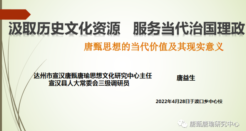 四川先锋网消息(冉容萍/文 荹莳/图)2022年4月28日至29日,达州市“达人达天下”——达州历史名人(唐甄)传承活动走进宣汉部分学校、社区。市巴文化研究院、宣汉教科局、文旅局,南坝镇、渡口土家族乡部分干部职工,渡口、昆池中心校学校师生、常乐社区干部群众以及讲座专家学者约300人参加活动。