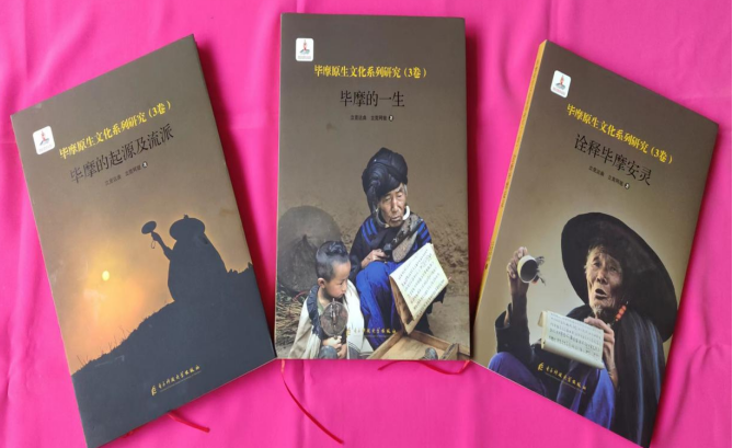 (已出版发行的《毕摩原生文化系列研究》丛书3卷 本史巫果摄)