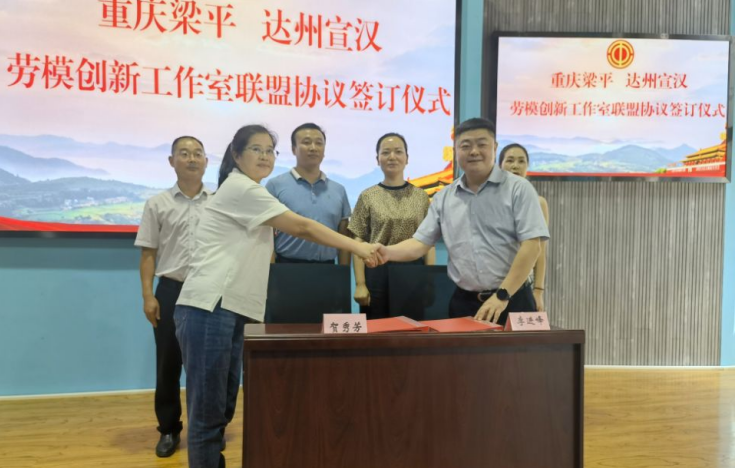 8月6日下午,在重庆市都梁科技企业孵化园,重庆市梁平区与四川省宣汉县签署《贺秀芳劳模创新工作室和李进峰劳模创新工作室联盟协议》。宣汉县总工会党组书记、副主席陈小平、梁平区总工会副主席李显炜等相关领导出席签字仪式。