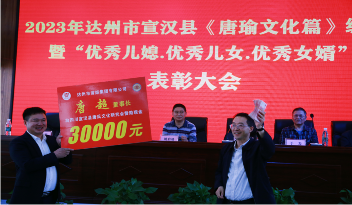 为支持四川宣汉县唐氏文化研究会编纂《唐瑜文化篇》暨帝师唐瑜古墓修复迁坟等工作,达州市首炬集团董事长唐超宗亲率集团全体员工向宣汉县唐氏文化研究会赞助现金3万元,之前,为支持四川宣汉县唐氏文化研究会唐鲤后裔棣祖支系编撰《唐棣文化篇》赞助2万元,合计赞助5万元,唐超宗亲的赞助行为和善举是对四川宣汉唐氏文化研究会工作及其唐甄唐瑜思想文化弘扬传承工作的有力支持。