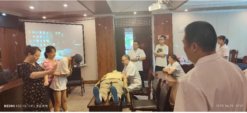 培训会上,专家组人员分别以风湿与疼痛三联序贯疗法、院前急救(心肺复苏+海姆立克法)和热射病的临床表现及治疗为题,融合实际工作情况及丰富的临床工作经验,进行了深入浅出的讲解;同时对景市镇中心卫生院医务人员进行了院前急救现场操作培训及技术指导。