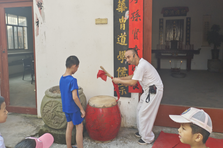 “张氏宗祠”,隐身于现代高楼,幽静而庄严。“张氏宗祠”匾、“祖功宗德”联、两个大红鼓。张老师让孩子们轮流体验击鼓,阵阵鼓声,敲开传统家族的大门,也敲开孩子们好奇的心扉。张老师便婉婉道来门档户对的寓意;“天地君亲师位”每个字的含义及写法。无不体现中华民族的智慧与人们对美好生活的期许。