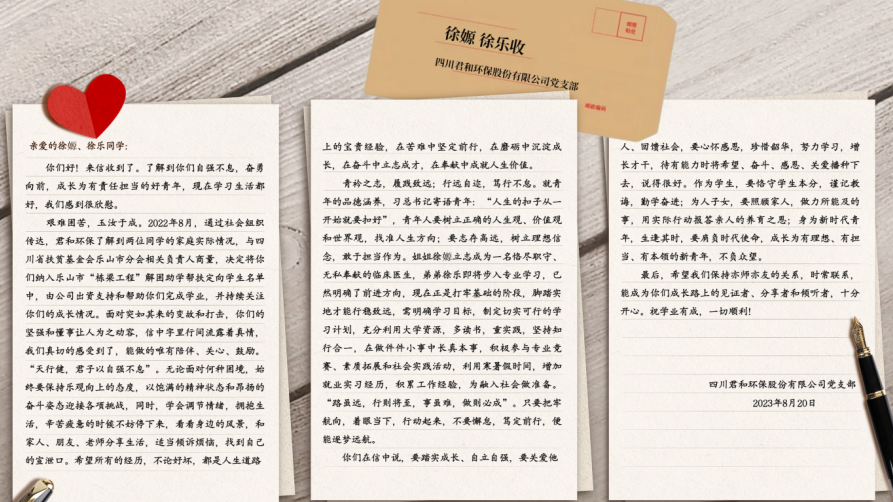 2023年8月3日,党支部先后收到了受助学生徐媛、徐乐同学寄来的感谢信,信中提到:“要踏实成长、自立自强,要关爱他人、回馈社会,要心怀感恩,珍惜韶华,努力学习,增长才干,待有能力时将希望、奋斗、感恩、关爱播种下去。”字里行间流露着真情实感,读到的是温情和感恩,收获的是自豪和幸福。党员罗楠作为两位同学的志愿者导师回信说道:“所有的经历,不论好坏,都是人生道路上的宝贵经验,在苦难中坚定前行,在磨砺中沉淀成长,在奋斗中立志成才,在奉献中成就人生价值。作为学生,要恪守学生本分,谨记教诲,勤学奋进;为人子女,要照顾家人,做力所能及的事,用实际行动报答亲人的养育之恩;身为新时代青年,生逢其时,要肩负时代使命,成长为有理想、有担当、有本领的新青年,不负众望。”学生和导师间互通书信,既是情感连接、信任培养,也是双向鼓舞与激励,志愿者导师们在指导过程中获得了育才的自豪感、成就感和荣誉感,并以学生的成长经历激励自己不断突破自我、飞跃赶超、与时俱进,提升能力以适应公司发展,同时为公司社会帮扶事业贡献力量。(供稿:罗楠)