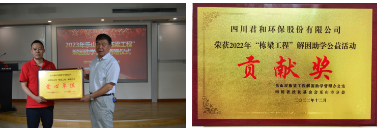 公司助学模式被乐山扶贫开发协会命名为“君和助学模式”,乐山助学项目入选国务院扶贫办中国社会扶贫创新典型案例。公司连续4年被授予“栋梁工程·扶贫助学”爱心单位,连续2年被授予“‘栋梁工程’解困助学公益活动贡献奖”,2021年被四川省扶贫基金会授予“社会扶贫突出贡献奖”。