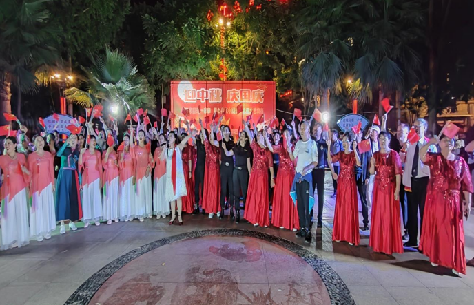“……五星红旗迎风飘扬,胜利歌声多么响亮,歌唱我们亲爱的祖国,从今走向繁荣富强。歌唱我们亲爱的祖国,从今走向繁荣富强。”一首由全体演职人员挥舞着国旗齐唱的《歌唱祖国》将晚会推向高潮。