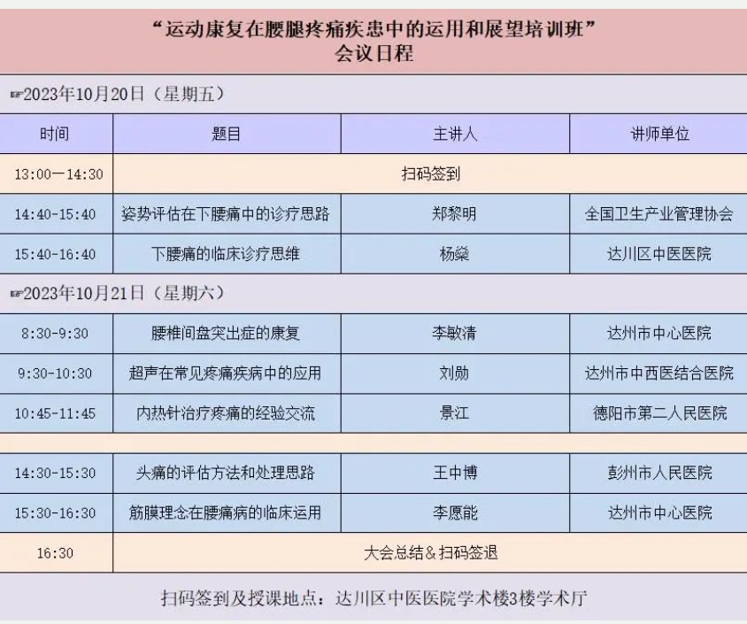 为进一步促进运动康复治疗的发展,提高运动康复诊疗水平,2023年10月20日—21日(本周五、周六),由达州市中医药学会主办,达川区中医医院承办的省级中医药继续医学教育项目《运动康复在腰腿疼痛疾患中的运用和展望》将在达川区中医医院学术厅隆重举行,届时省内外知名康复专家郑黎明、王中博、李敏清、景江、杨燊等作学术报告、经验交流和病例分享。