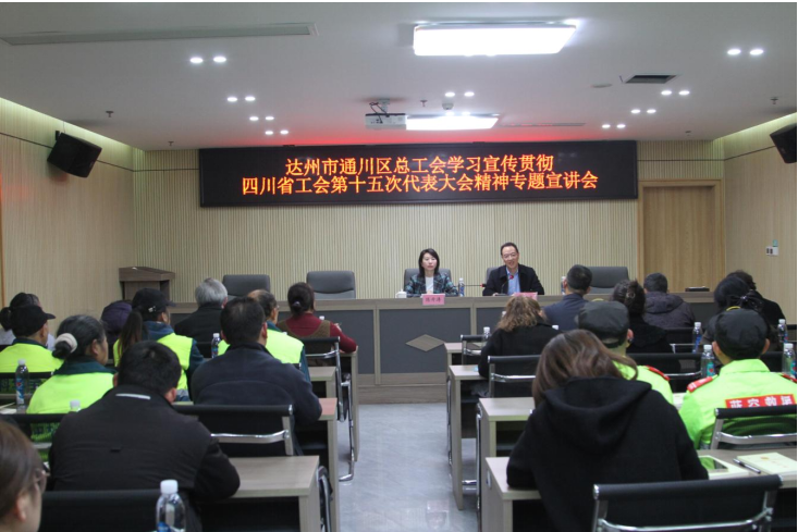 11月24日,通川区总工会在区职工活动中心组织召开学习宣传贯彻四川省工会第十五次代表大会精神专题宣讲会,省工会十五大代表、区委常委、统战部部长、区总工会主席陈升涛作专题宣讲,区总工会党组书记、副主席李良主持会议。来自通川区的劳动模范、新就业群体、一线职工、基层工会代表和机关干部职工共计50余人参加会议。