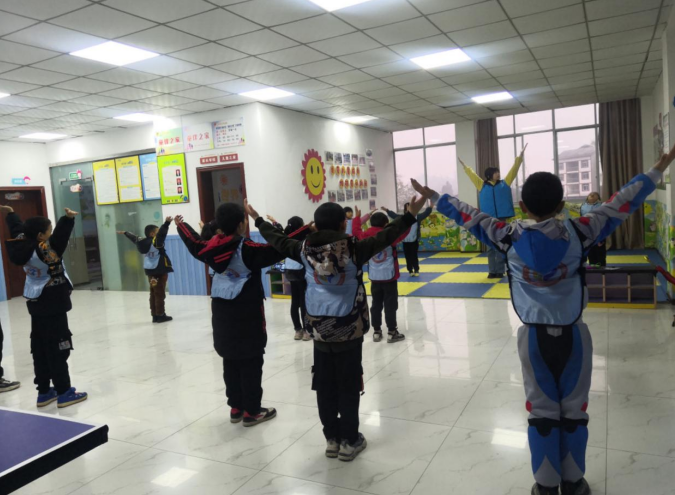 (杨家镇青年志愿服务队员带小朋友们跳健身操)