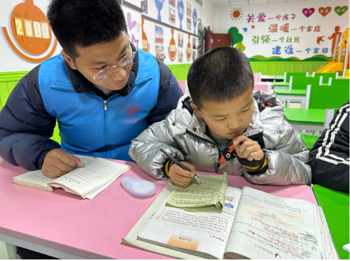 (杨家镇青年志愿服务队员在周末课堂辅导儿童课业)