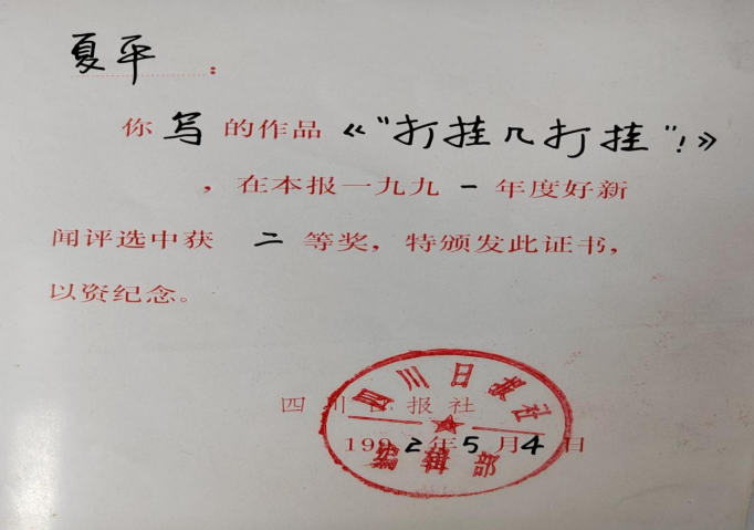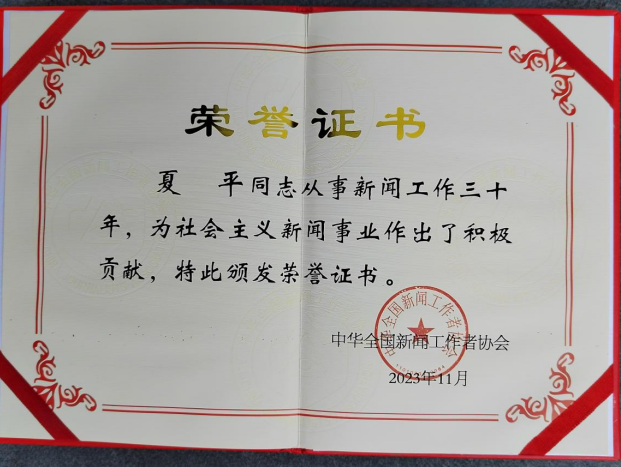 马边的骄傲,夏平荣获从事新闻工作三十年荣誉证章