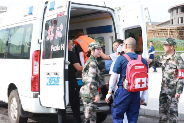 救援队三艘冲锋舟成一字形开往湖滩待转移区域,有序将灾民接上冲锋舟并到达岸边安全区,由负责安置的应急人员引导上岸,安置到救灾帐篷。其中将受伤几人进行院前急救包扎,待120车到达现场后,抬上救护车送至医院作进一步救治,进入安置区的灾民有序排队领取食物。