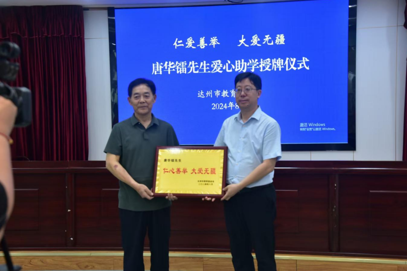 仪式上,达州市教育基金会秘书长曾建春介绍了唐华镭先生爱心助学情况。据悉,本次爱心人士唐华镭先生共计捐赠现金35万元,其中,5万元用于关爱留守儿童公益活动,30万元用于资助品学兼优及贫困学生,奖助标准为每人5000元。