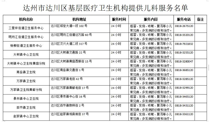 达州市达川区基层医疗卫生机构提供儿科服务名单