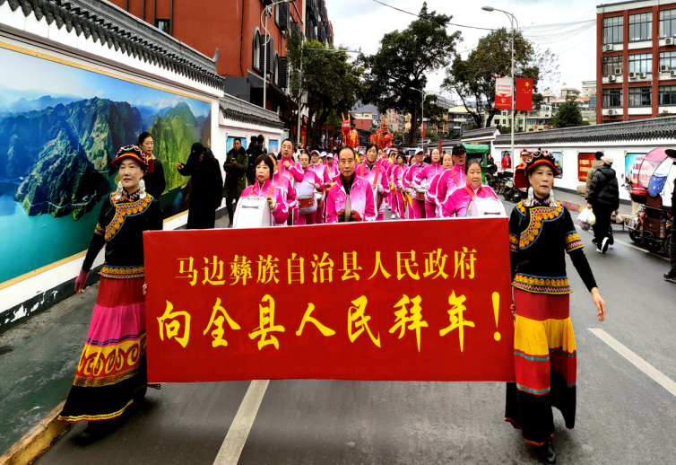 1月25日上午10点,由马边彝族自治县老年人体育协会文化艺术分会承担的龙灯锣鼓拜新年拉开帷幕。60多人巡游队伍身着整齐服装,抬着“马边彝族自治县人民政府向全县人民拜年”的横幅,敲锣打鼓,舞着龙灯,向全县人民拜年,引来许多观众驻脚观赏,赢得广大群众的一致好评。