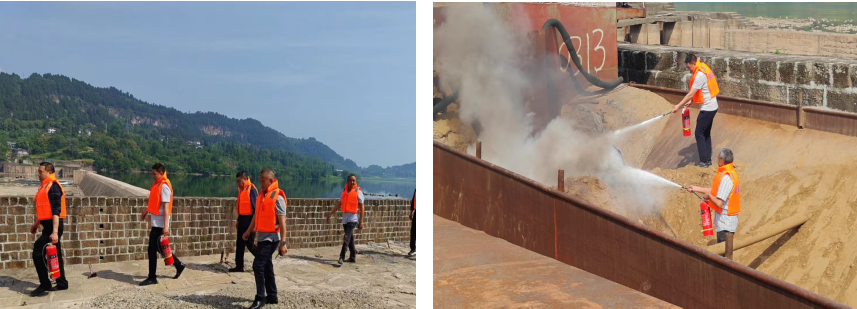 演练模拟了船舶在船闸内突发火灾,火势迅速蔓延,对周边船舶及船闸设施构成严重威胁。发现火情后,港航中心立即启动应急预案,组织船闸 工作人员在火灾现场周围设置警戒区域,迅速关闭闸门,暂停船舶通行,切断相关电路和油路,防止火势进一步蔓延,引导闸内船上人员和周边船舶疏散至安全区域,快速启动船闸固定消防设施,对起火部位进行初期扑救和外围控火。火势被扑灭后,应急人员对现场进行了仔细检查,确认无复燃隐患后及时清理闸室内杂物,在确保安全的前提下,逐步恢复船闸的正常通航秩序。本次演练,中心还针对船闸设备突发故障,导致闸门无法正常启闭,船舶滞留;恶劣天气引发的水位骤变,给船闸运行和船舶通航带来极大风险等情况进行了应急处置。