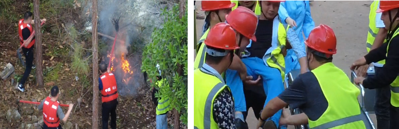 在森林防火应急演练中,模拟山林过火面积已达100平方米,威胁施工机械及10名作业人员安全,并因浓烟导致1人“窒息昏迷”。参练人员按照扑救隔离、伤员急救、余火清理的步骤,首先采用灭火器压制明火,砍刀开辟隔离带,随后对窒息昏迷人员进行心肺复苏,联动120急救车转运,并翻查灰烬、设置监测岗,严防复燃。