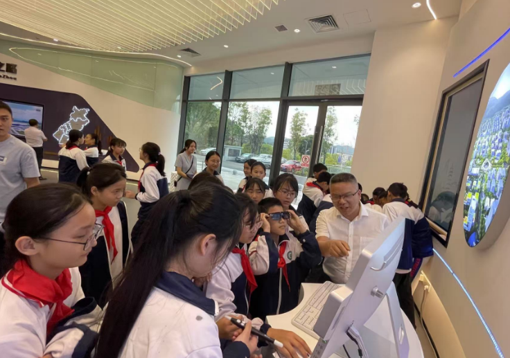 在达州大数据基地展厅内,学生们跟随讲解员穿梭于智慧城市沙盘与数据流瀑墙之间,亲眼见证数据采集、分析和应用的场景,将抽象的“大数据”概念转化为具象认知,有效激发了学生对现代科技的兴趣。市先进工作者严鹏化身“行走的课堂导师”,指导学生戴上VR眼镜,在教学一体机模型前手把手指导学生操作设备,通过互动让同学们了解数据工程师、程序员等新兴职业的工作内容,打破了对“工作”的传统认知,在孩子们心中种下探索科技领域的种子。