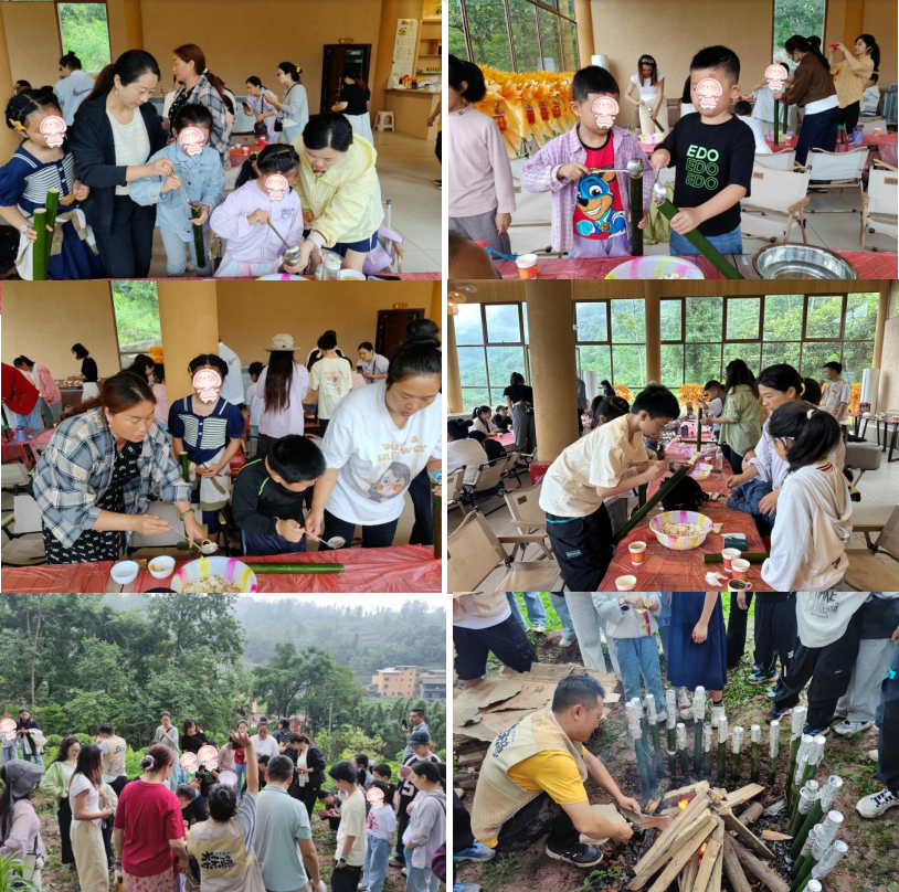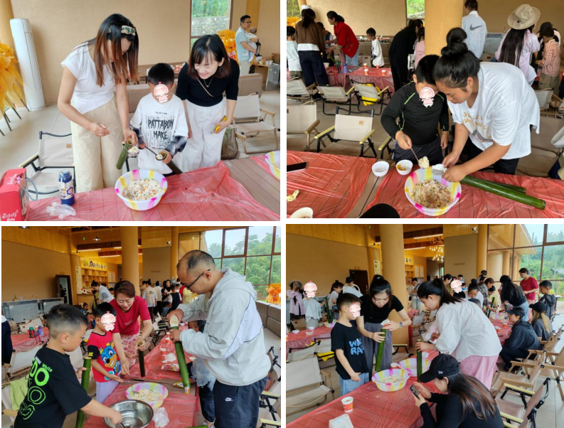 要想做出一顿美味的竹筒饭,前期准备工作至关重要,尤其是选取合适的竹筒。对于哪种竹子最适合制作竹筒饭,家长们最有发言权。在专业老师的带领下,家长和孩子们一同上山砍竹,精心挑选出最适合、最新鲜的竹子。砍好竹子后,大家将竹子洗净,接着,孩子们和家长齐心协力制作竹筒饭。他们小心翼翼地把提前准备好的糯米、红枣、腊肠等食材一勺一勺地灌进竹筒里,加入适量的水,再用竹叶把竹筒口封住,放入柴火灶中蒸制。