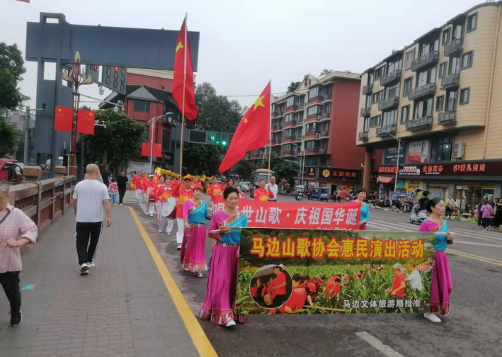 9月28日,马边老体协山歌分会的巡游队伍身着整齐的服装,精神抖擞齐聚法制广场。现场锣鼓喧天,热闹非凡。巡游队员们迈着整齐的步伐开启了“唱盛世山歌.庆祖国华诞”巡游,所到之处吸引了众多市民驻足观看。党旗和国旗迎风招展,崭新的龙灯狮灯随着音乐不停地舞动,给马边各族人民带来心灵的震撼。巡游队伍从法制广场出发,经彩虹桥到三九广场再过北门桥,最终到达熊猫广场。
