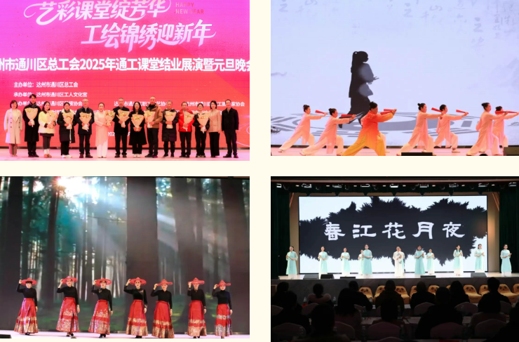 12月24日,通川区总工会2025年“通工课堂”结业展演暨元旦晚会在市工人文化宫举行。活动集中展示公益培训成果,生动体现了职工在技能提升、审美素养和身心健康方面的综合收获。2025年,“通工课堂”突破单一课程范畴,围绕职工职业与爱好需求,联合名师开设书法、瑜伽、水粉画、羽毛球等20余门课程,招收学员突破700名,通过持续优化供给,实现了从“基础服务”到“深度赋能”的转变,成为了深受职工信赖的“成长加油站”与“精神家园”,为培育高素质职工队伍、繁荣职工文化发挥了实质性作用。