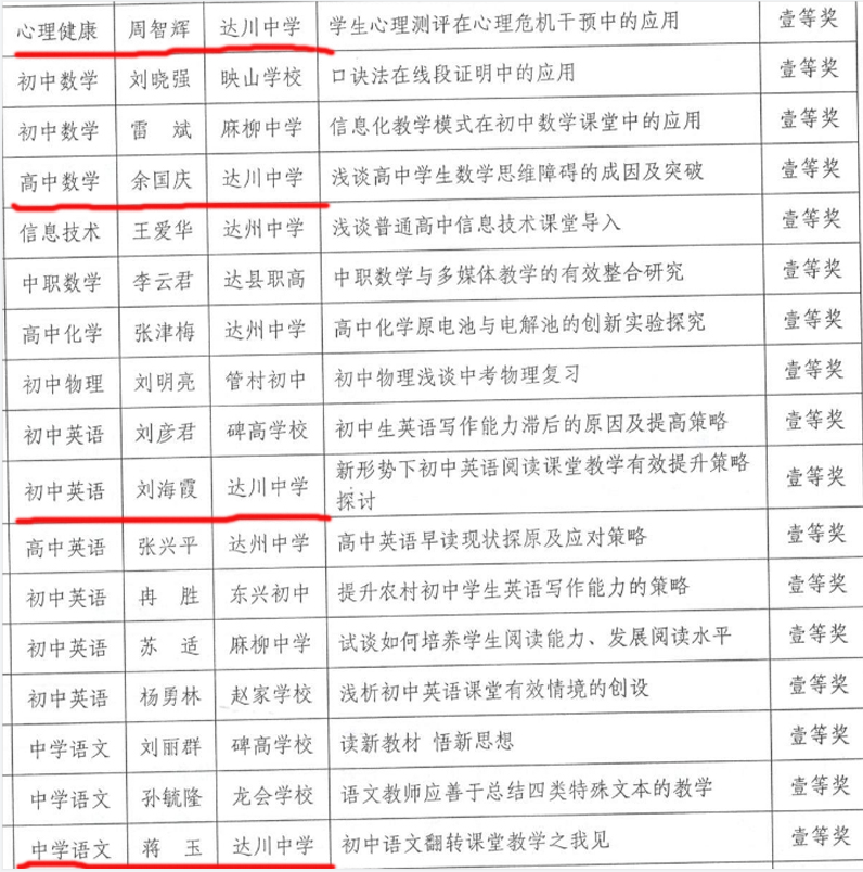 达川中学15名教师在区教师教学优秀论文评审获奖