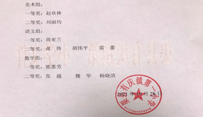 在本次赛课活动中,该校教师精心准备,大显身手,老师们赛出了风格,赛出了水平,取得了优异的成绩。经评委们公平公正的评比,本次赛课获得一等奖的有:美术组 赵欢林;语文组 周亚兰;数学组 熊惠芳。获得二等奖的有:美术组 刘丽均 语文组 蒋伟 胡伟平 雷蕾 数学组 张越 魏华 杨晓清