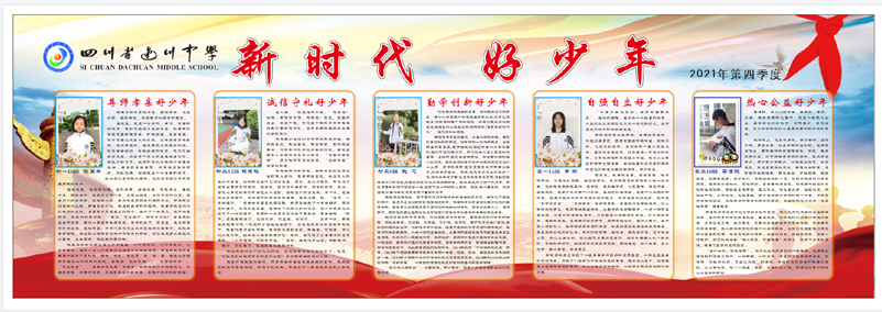 四川先锋网消息(袁小娟)为深入贯彻落实党的十九大和全国宣传思想工作会议提出的“培养担当民族复兴大任的时代新人”要求,进一步加强和改进未成年人思想道德建设,切实提高学生思想道德素质,2021年11月22日至11月26日,四川省达川中学开展了“新时代好少年”评选活动。